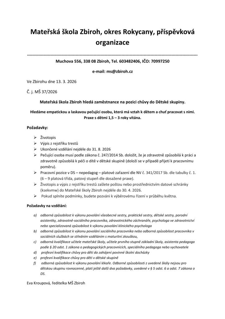 📝 Podklady: Životopis a výpis z rejstříku trestů zašlete poštou nebo datovou schránkou (ksekvmw) do 30. 4. 2026.