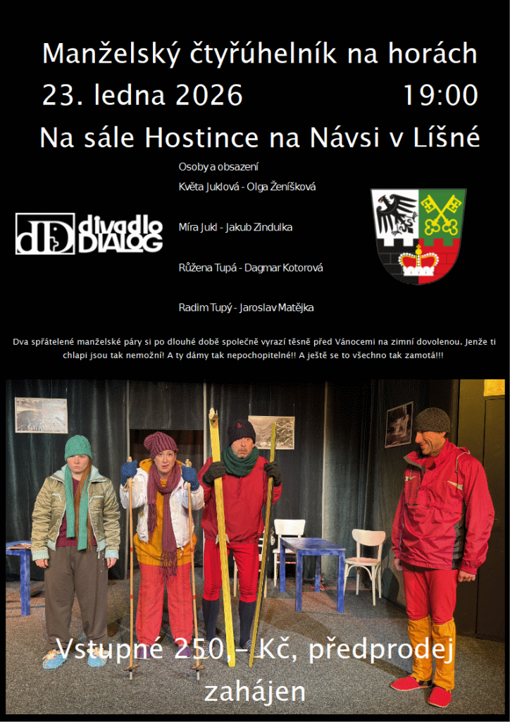 Dne 23. ledna 2026 v 19:00 se na sále Hostince na Návsi v Líšné uskuteční představení "Manželský čtyřúhelník na horách". Tato komedie vypráví příběh dvou spřátelených manželských párů, kteří se rozhodnou vyrazit na zimní dovolenou. Jak už to tak bývá, situace se brzy zamotá a obě dámy i pánové se ocitají v nečekaných a humorných situacích. Srdečně zveme všechny milovníky dobré zábavy na tuto komediální podívanou.